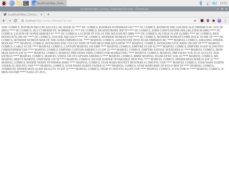 The web application consists of one file - index.php. You can download the web application below to install it on your Raspberry Pi - New_Comics_Releases.zip.