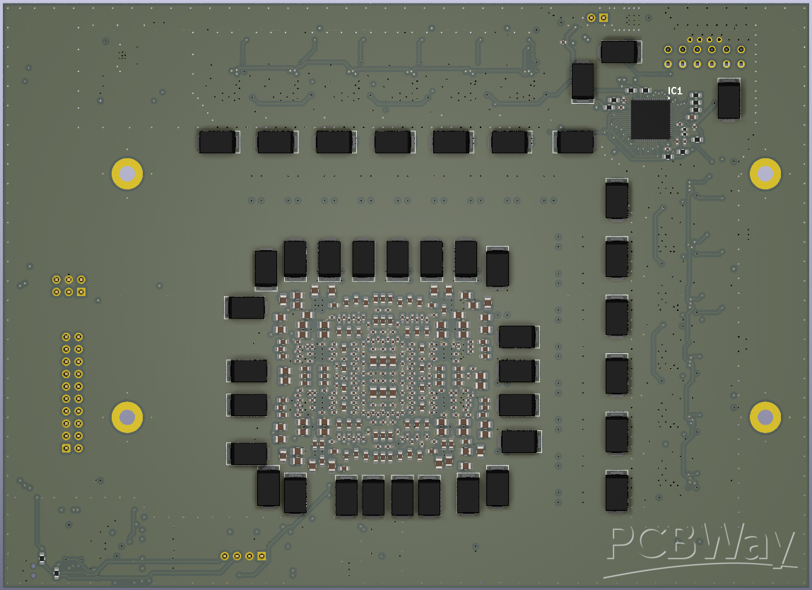 A hierarchical decoupling strategy is used throughout the design. SMD polymer bulk capacitors provide energy storage and support lower-frequency load changes, mid-band MLCCs bridge the gap between bulk storage and high-frequency demand, and dense arrays of small MLCCs are placed close to the load region to minimise loop inductance and support fast transients.