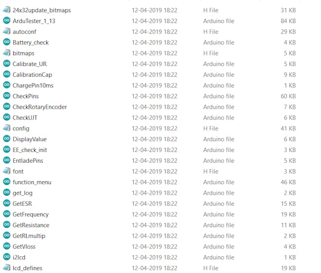 Full code can be downloaded from here, try to install the latest libraries for the LCD. You can comment here, if found any problem in uploading the code. The code calls more than 10 files, so don’t get confuse with that only keep focus on Ardu-tester_1_13 and upload it using simple steps.