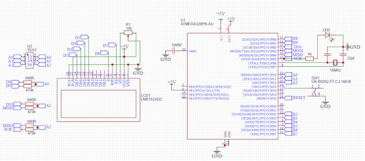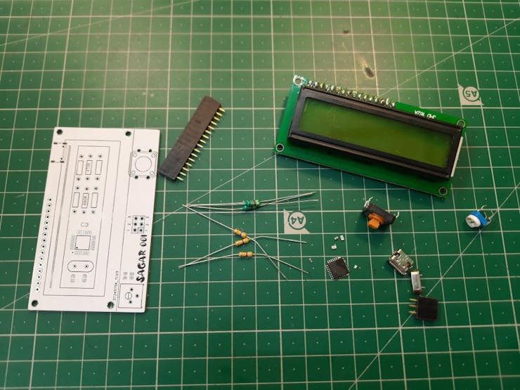 Arduino SMD microcontroller with 16Mhz crystal and 22pf capacitor for impedance matching. 470K and 680 Ohms resistor divider network is given to the ADC of Arduino. These values can be calibrated inside the code also. I always to prefer to get a microcontroller chip directly from the top of Arduino Nano after burning sketch into it.
