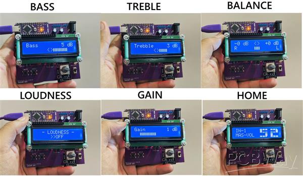 The user interface is smooth and works well with encoder. The menu screen has different options related to volume, treble, bass and gain. All of this can be switched using the encoder button and select the further operation by rotating. See all the screens here:
