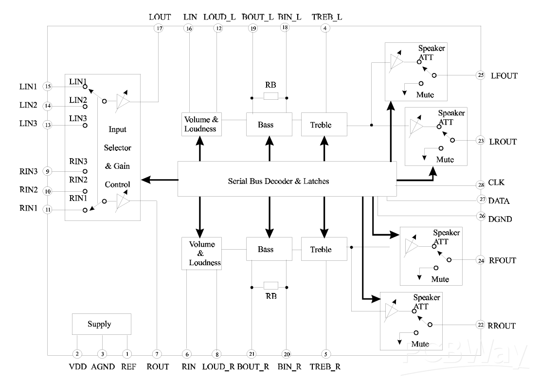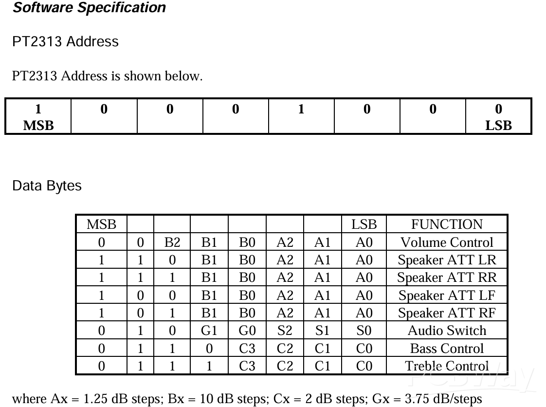 I found the one, it is quite old “PT2313” from Princeton Taiwan. PT2313 is a four-channel digital audio processor utilizing CMOS Technology. Volume, Right/Left Bass and Treble Balance, Front/Rear Fader Processor are incorporated into a single chip. Loudness Function and Selectable Input Gain are also provided to build a highly effective electronic audio processor having the highest performance and reliability with the least external components. All functions are programmable using the Serial Bus. The pin assignments and application circuit are optimized for easy PCB layout and cost saving advantage for audio application.