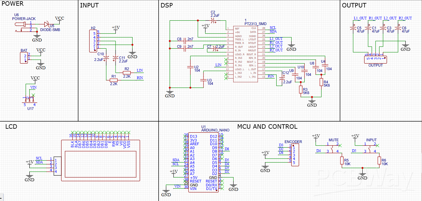 I am using this chip to feed to an amplifier circuit, this chip can be used as a standalone preamplifier circuit. Now because it has 3 inputs, but here I don’t need that much so I am using only one of them. But at the output I am using all 4, in which 2 will not work (reserved for later). So this will be a 2 channel system through which I can control Channel gain, volume, bass, table and balance. Because the system works with I2C we can directly connect a compatible microcontroller like UNO/NANO. Some required components are: