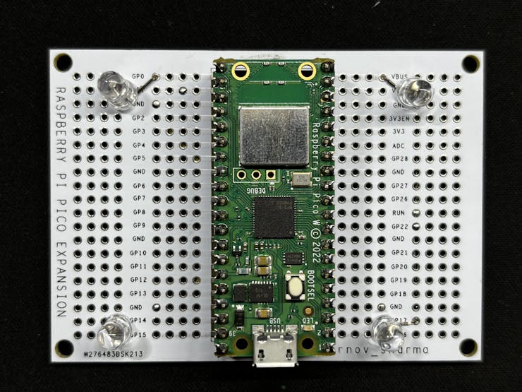 We coupled the PICO W with our previously created PICO Expansion board, which breaks out all of PICO's GPIO pins and adds extra pins that may be used to pair sensors and other electronic devices with PICO. In our case, we added four 5mm RED LEDs to PICO W's GPIO pins.