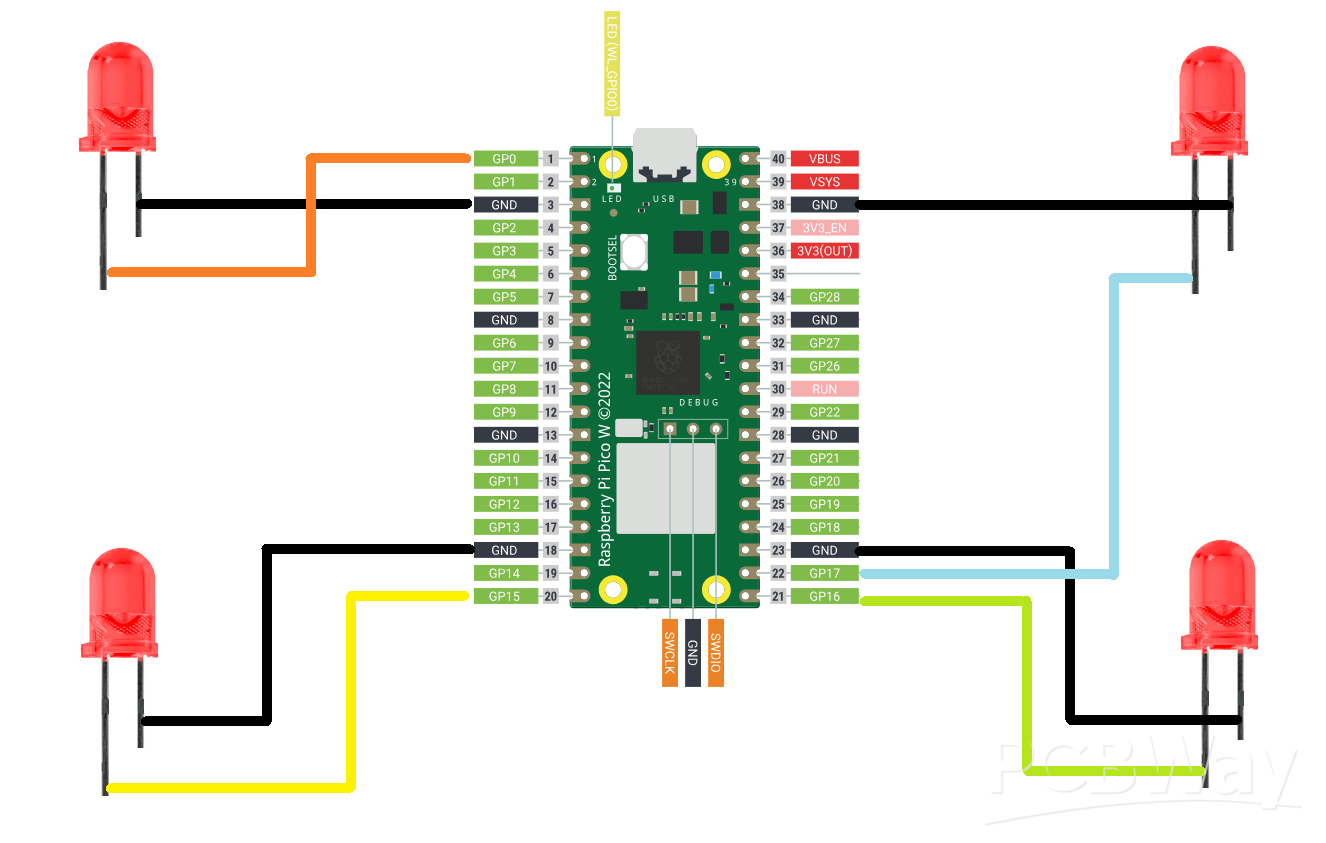 The anode of the LEDs is linked to GPIO0, GPIO15, GPIO16, and GPIO17, while the cathode of all LEDs is connected in parallel and then coupled with the GND of PICO W.