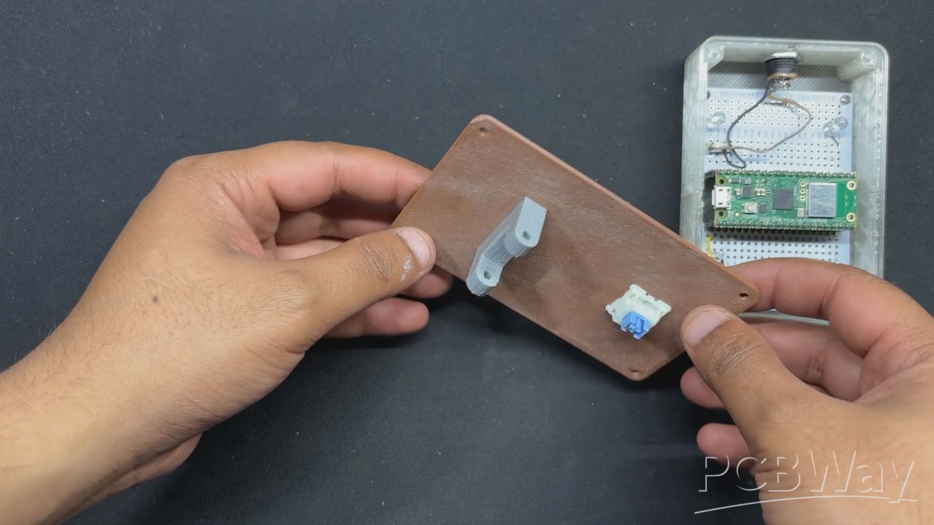 A mechanical Blue Switch has been added to the Lid part, and the Lever is positioned above the Mechanical Switch; when the lever is pressed down, the switch toggles, and a switch press is registered by the PICO W.