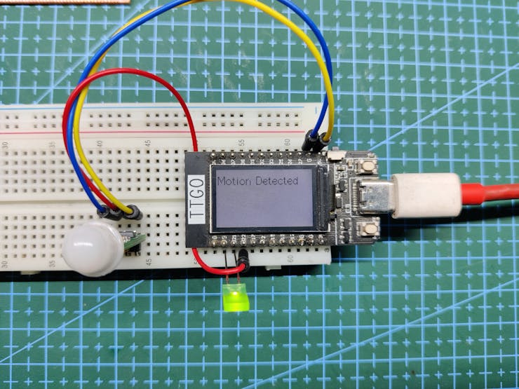 Here's the second setup that uses a TTGO T Display board to Turn ON and OFF an LED and also display a message when motion is detected on its onboard RGB Display.
