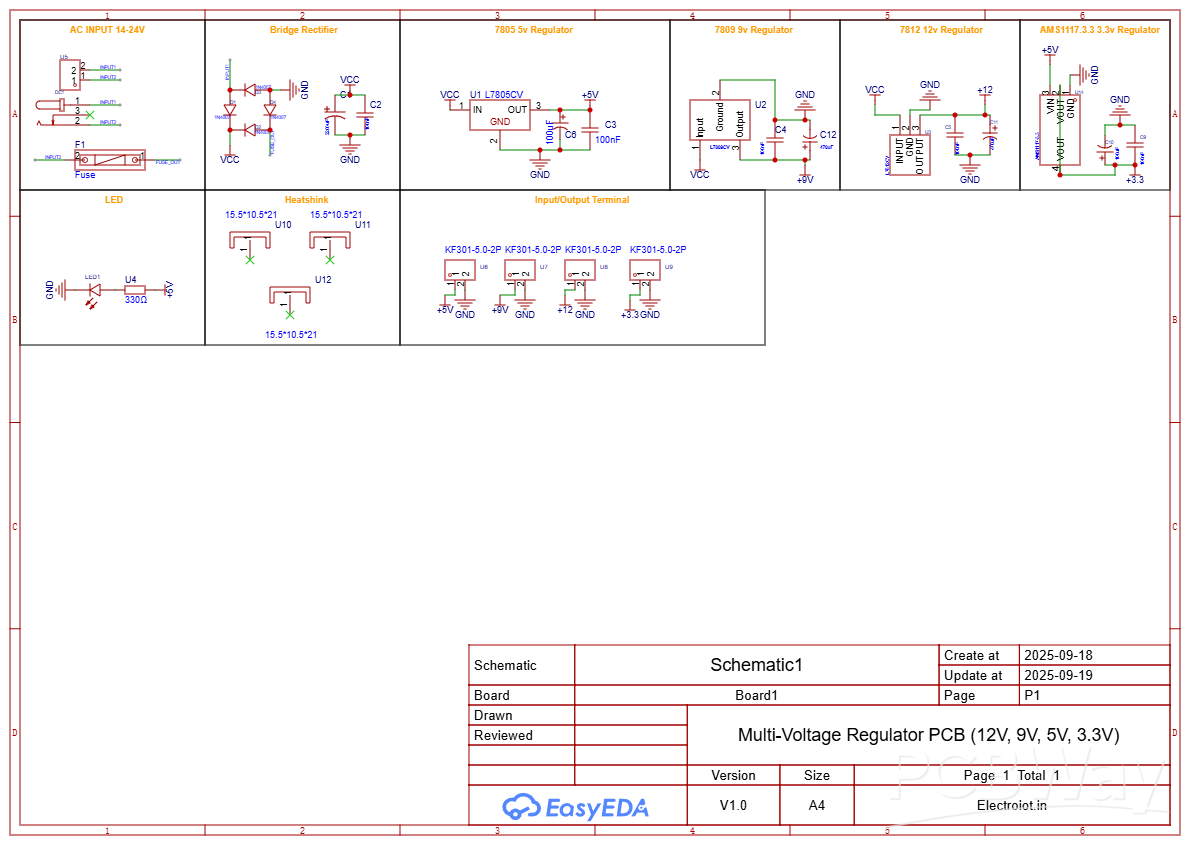 This project demonstrates the design and implementation of a Multi-Voltage Regulator PCB that provides 4 output voltages: 12V, 9V, 5V, and 3.3V. The circuit uses four voltage regulators: