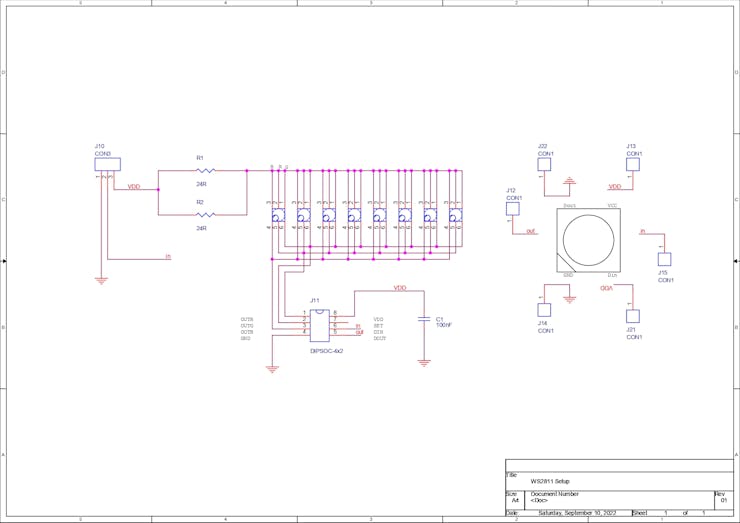 I created the circuit by using the WS2811 datasheet's schematic as a guide, and I utilized 8 RGB LEDs linked in parallel with the IC.