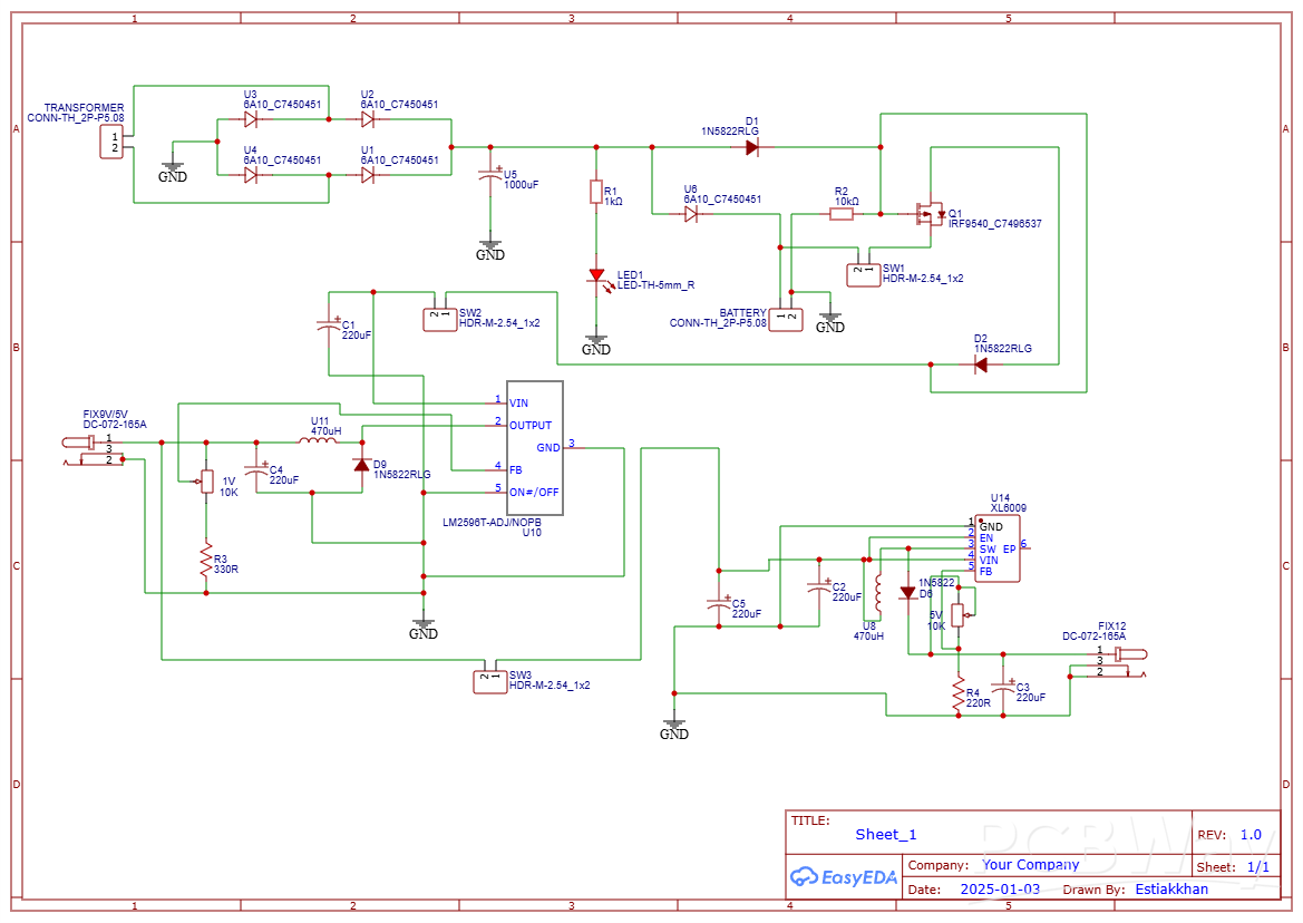 LM2596 & XL6009 DC-DC converters provide stable 5V / 9V / 12V outputs.