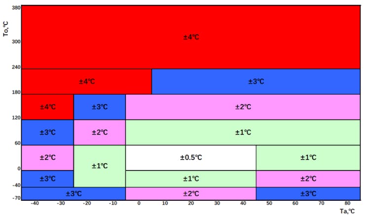 The gradient diagram of the sensor measurement accuracy is shown below (To is the measured temperature; Ta is the temperature of the environment in which the sensor is located). Note that the temperature error only applies to a certain isothermal condition, and is only valid when the detected object is completely filling the sensor's field of view.