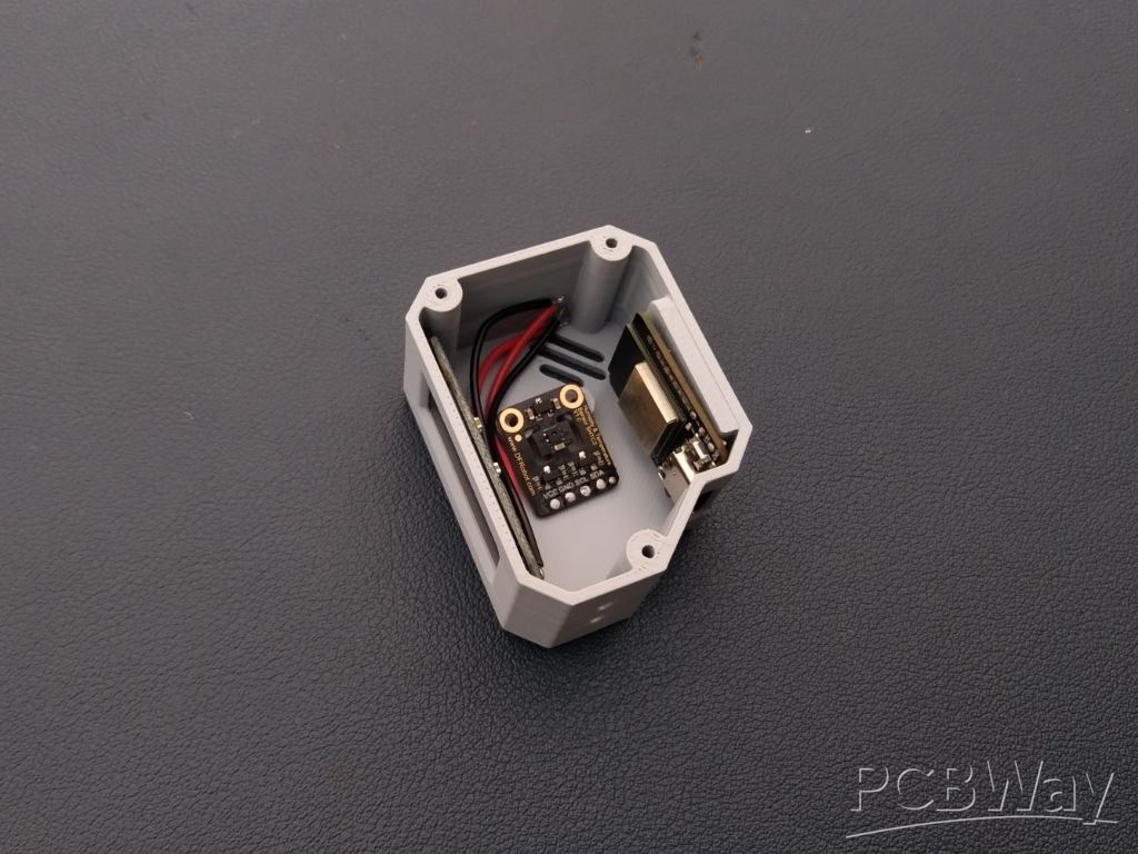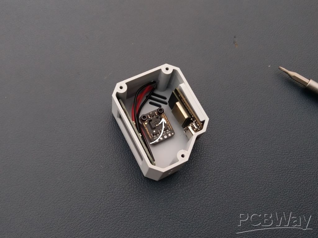 Once the microcontroller is in place, it’s time to install the final main component — the SHTC3 Temperature and Humidity Sensor. Carefully position the sensor in its dedicated slot inside the enclosure. Use two small M3 screws to secure it firmly with the help of a screwdriver. Make sure the sensor is properly aligned and tight enough so it stays fixed during use.