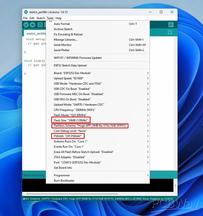 First, you need to use Arduino IDE version 1.8.15 or later. Then you need to install Newest ESP32 Core. Now in Tools-Board-ESP32 Arduino, we need to select ESP32S3 Dev Module. In this board, we need to make several changes to the properties: Flash Size 16MB, Partition scheme- Huge App, and PSRAM - OPI PSRAM.