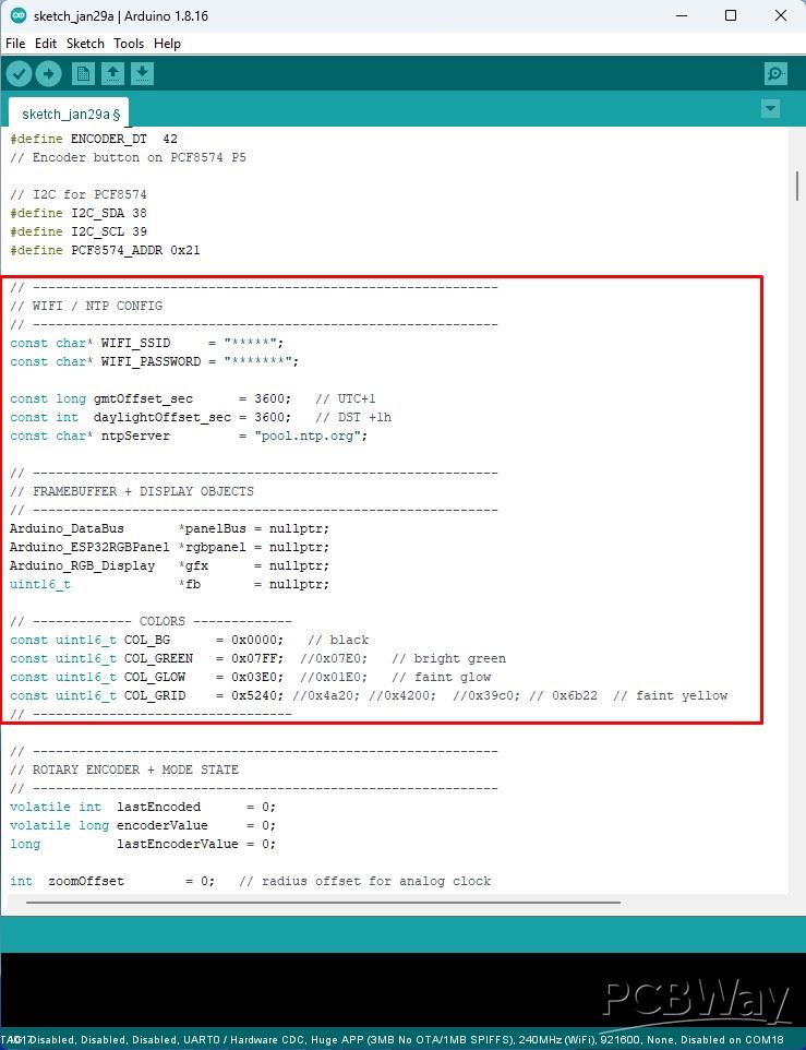 You also need to install the Arduino_GFX_Library. Now we can compile and upload the code without errors. As for the code, the basic settings are located at the beginning, here you need to insert the Wi-Fi credentials, the NTP Server, as well as the definition of the display colors.