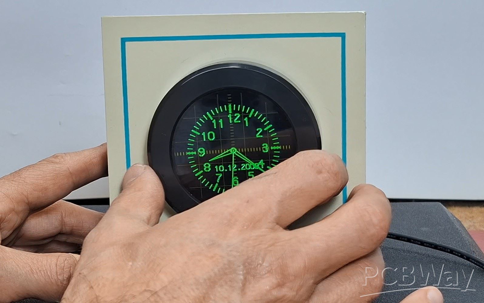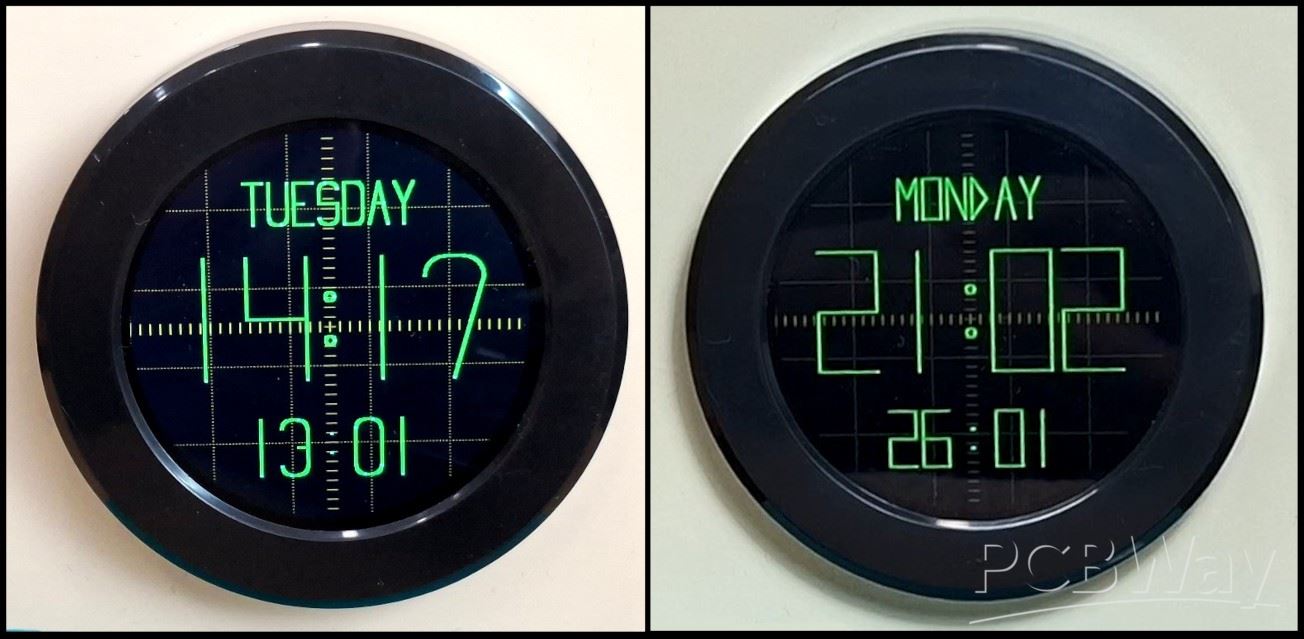 Now let's see how the device works in real conditions. Immediately after turning on the clock connects to the Wi-Fi network and gets the correct time from the NTP server. Then an analog clock appears on the display in the style of an Oscilloscope clock with a characteristic green color. Even a "glow" effect has been added when drawing the characters, but unfortunately it is almost not noticeable in the video recording. To make it even closer to the original, I added an option to change the dimensions of the clock using the rotary encoder that is part of the display module.