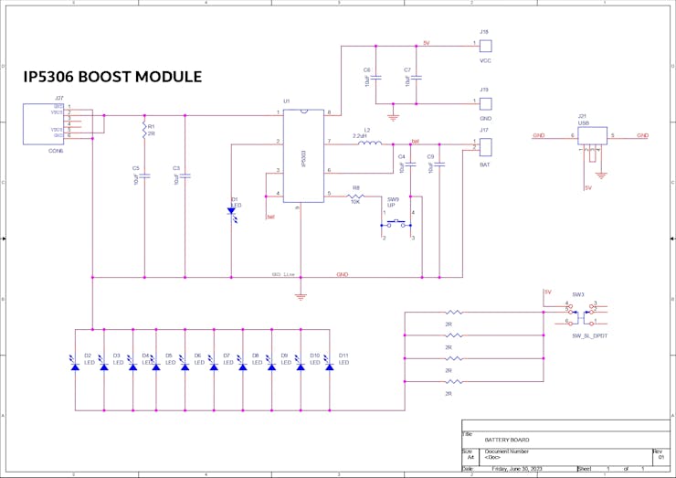 The Power Management Board consists of an IP5306 IC with all necessary parts, such as input and output capacitors, an inductor, etc.