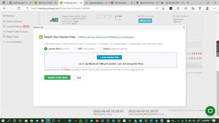 Click calculate to get the first quote, then hit save to cart. Then, another window will pop out where you need to submit your Gerber files for the team of experts to review and give you a final quote.