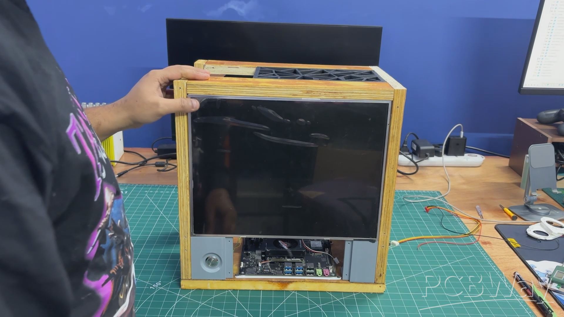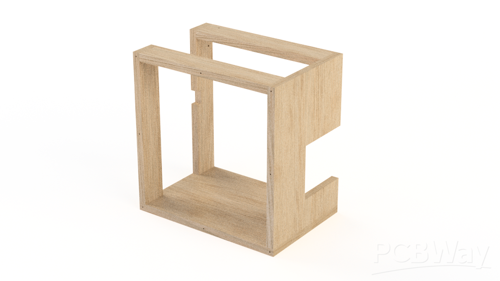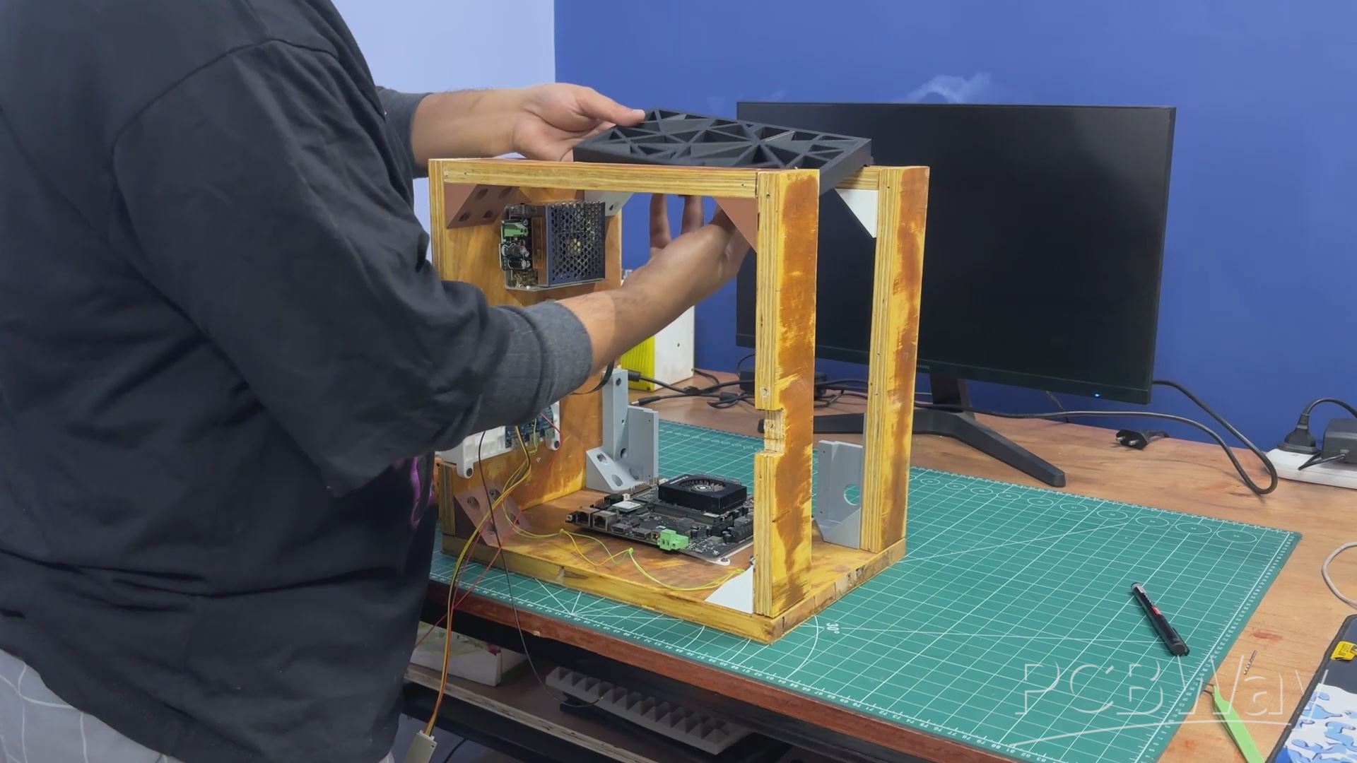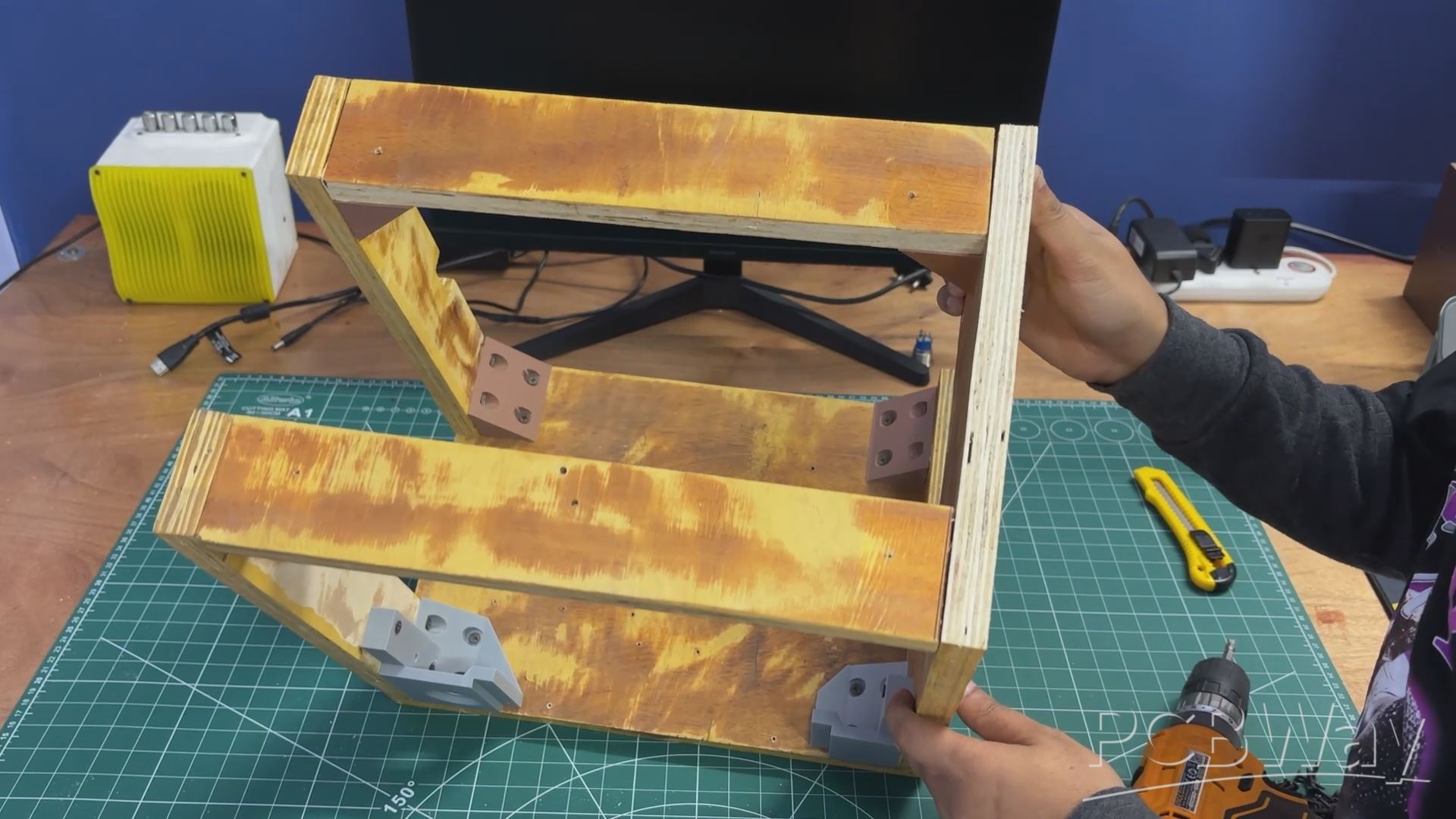 The body was primarily constructed from plywood, chosen for its strength and ease of fabrication. 3D-printed L-brackets were used to join panels together, forming a rigid cuboid enclosure capable of housing the motherboard, power supply, storage drives, and display.