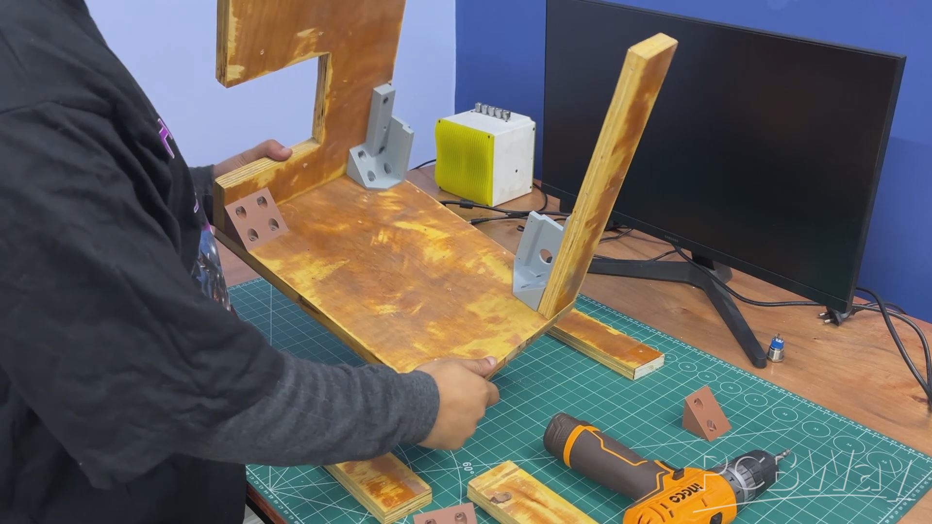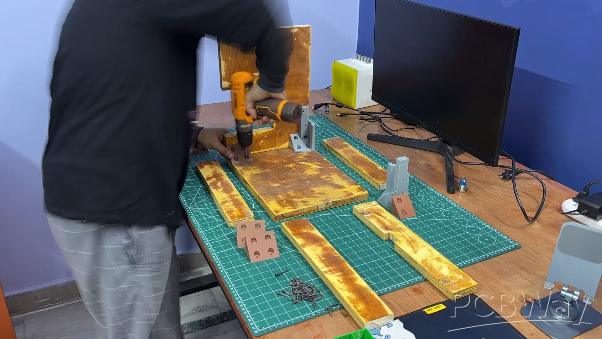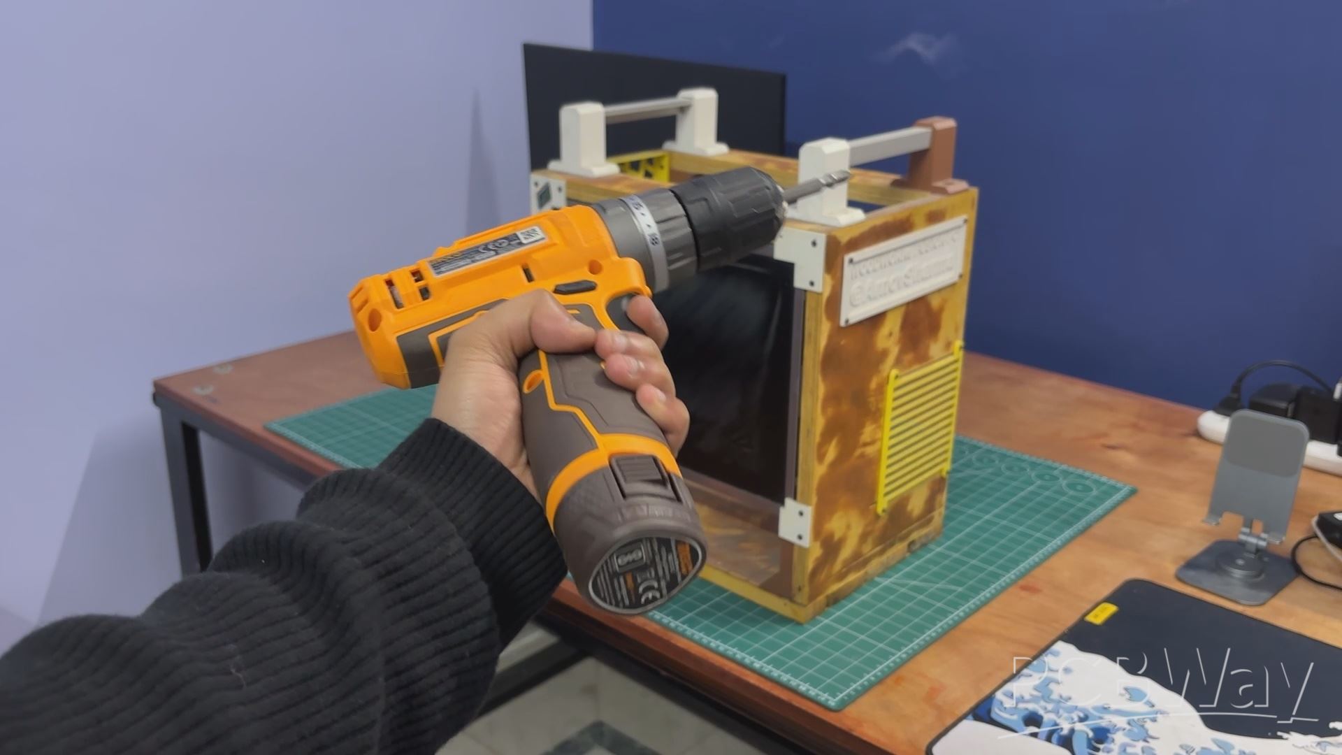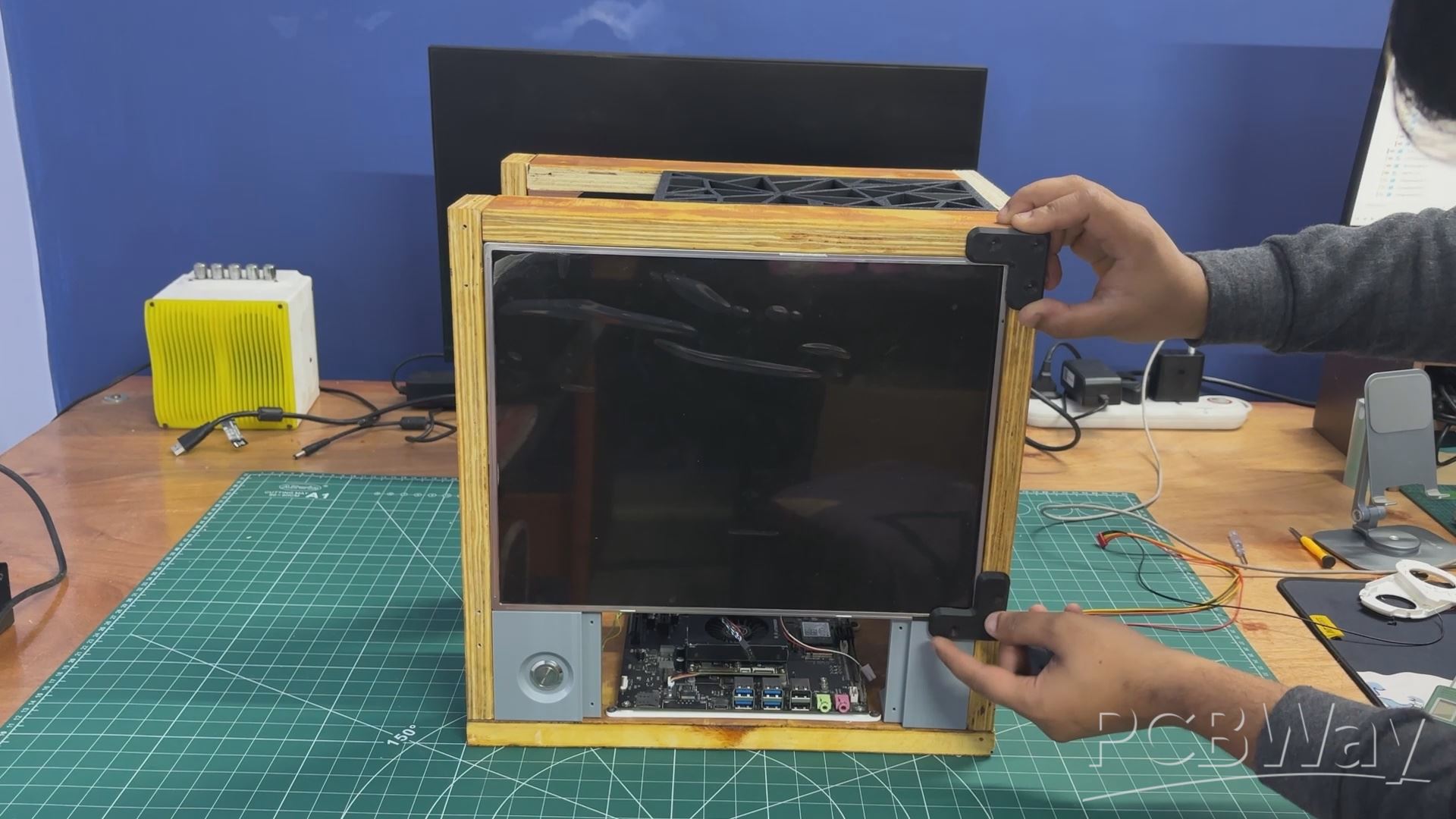 The body was primarily constructed from plywood, chosen for its strength and ease of fabrication. 3D-printed L-brackets were used to join panels together, forming a rigid cuboid enclosure capable of housing the motherboard, power supply, storage drives, and display.