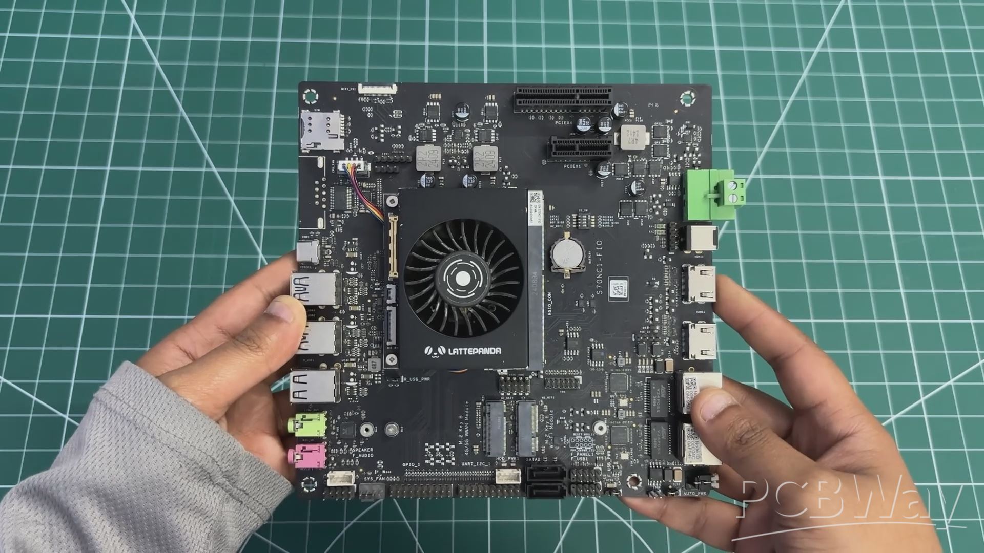 The evaluation board exposes standard PC I/O, including multiple USB ports, full-size HDMI and DisplayPort outputs, Gigabit Ethernet, and audio I/O, allowing the MU to be used like a conventional desktop computer. It also provides PCIe expansion, enabling support for high-speed peripherals such as NVMe SSDs, network cards, or other PCIe devices.