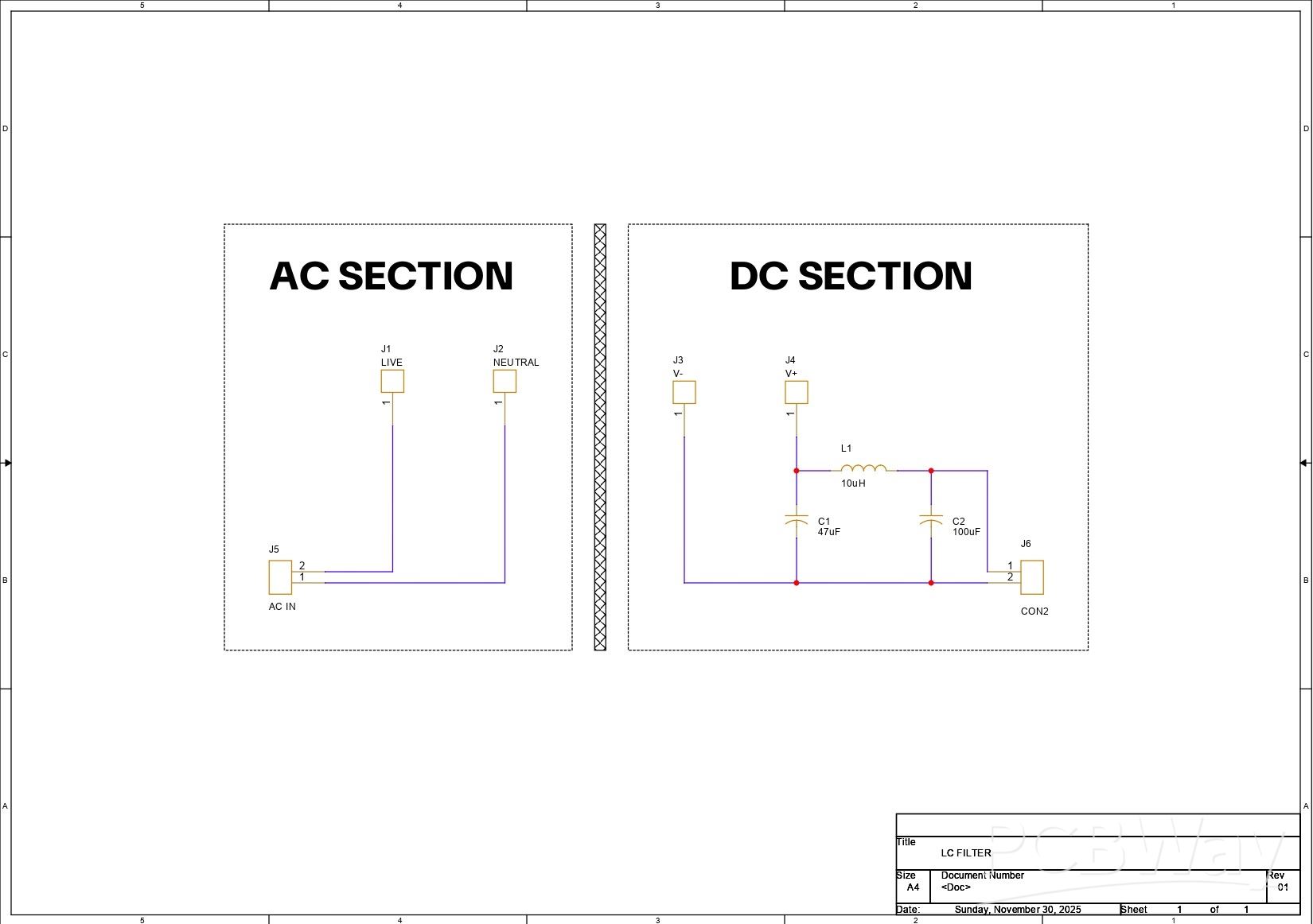 The LC filter is implemented by connecting a 10 µH inductor in series with the positive output line. On both sides of the inductor, decoupling capacitors are connected between the supply rail and ground, forming a C–L–C (π-filter) configuration. The capacitor placed before the inductor helps absorb high-frequency switching noise coming directly from the SMPS, while the capacitor placed after the inductor smooths the remaining ripple and provides a more stable voltage to the load.