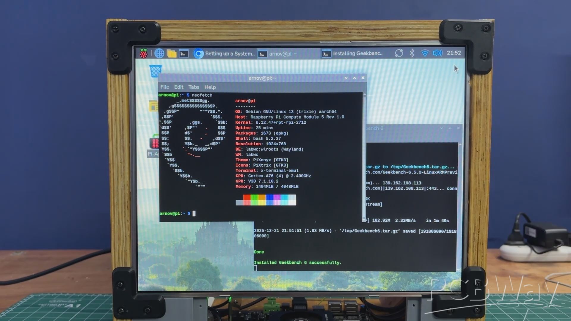 Next, using the front-mounted button, we switch the display output from the LattePanda MU to the Raspberry Pi Compute Module 5, which is running the new Trixie OS—a port of Debian Trixie.
