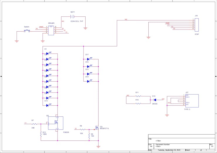 Next, I prepared a simple Schematic with other Attiny13A MCU that had two Mosfet as Switch setup, One Mosfetr that only had 4 LEDs connected in series was the AO3401 N channel mosfet which can handle 4A of current at 30V max.