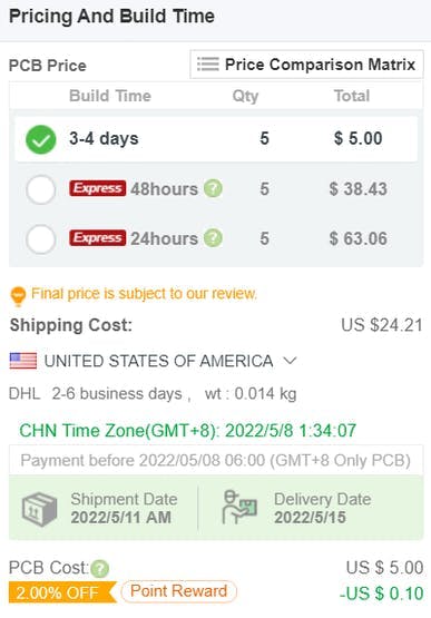 Upload the Gerber file, now engineers will inspect the PCB dimensions, tracks and type and give you the final quote (This will take 5 to 10 minutes).