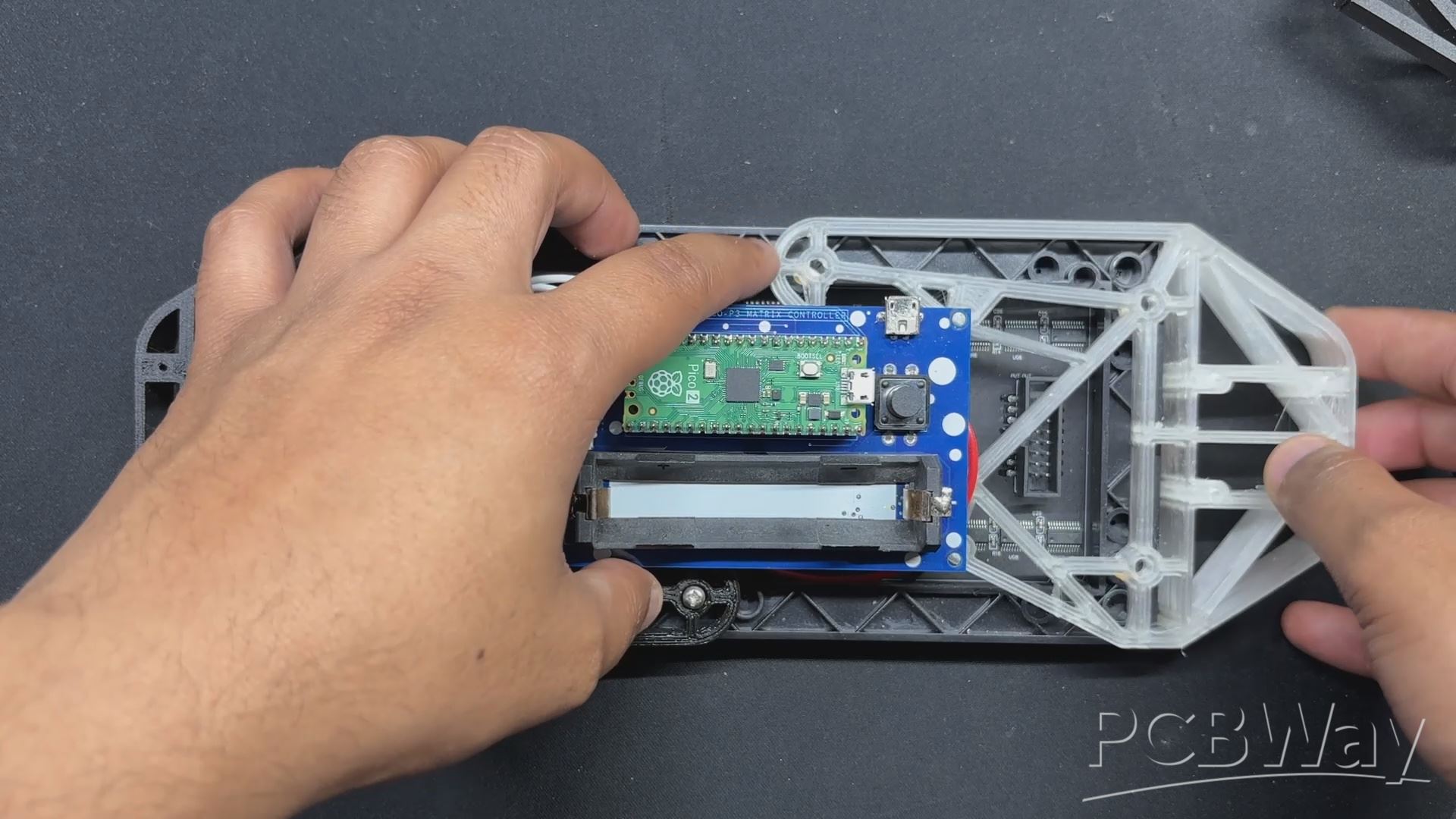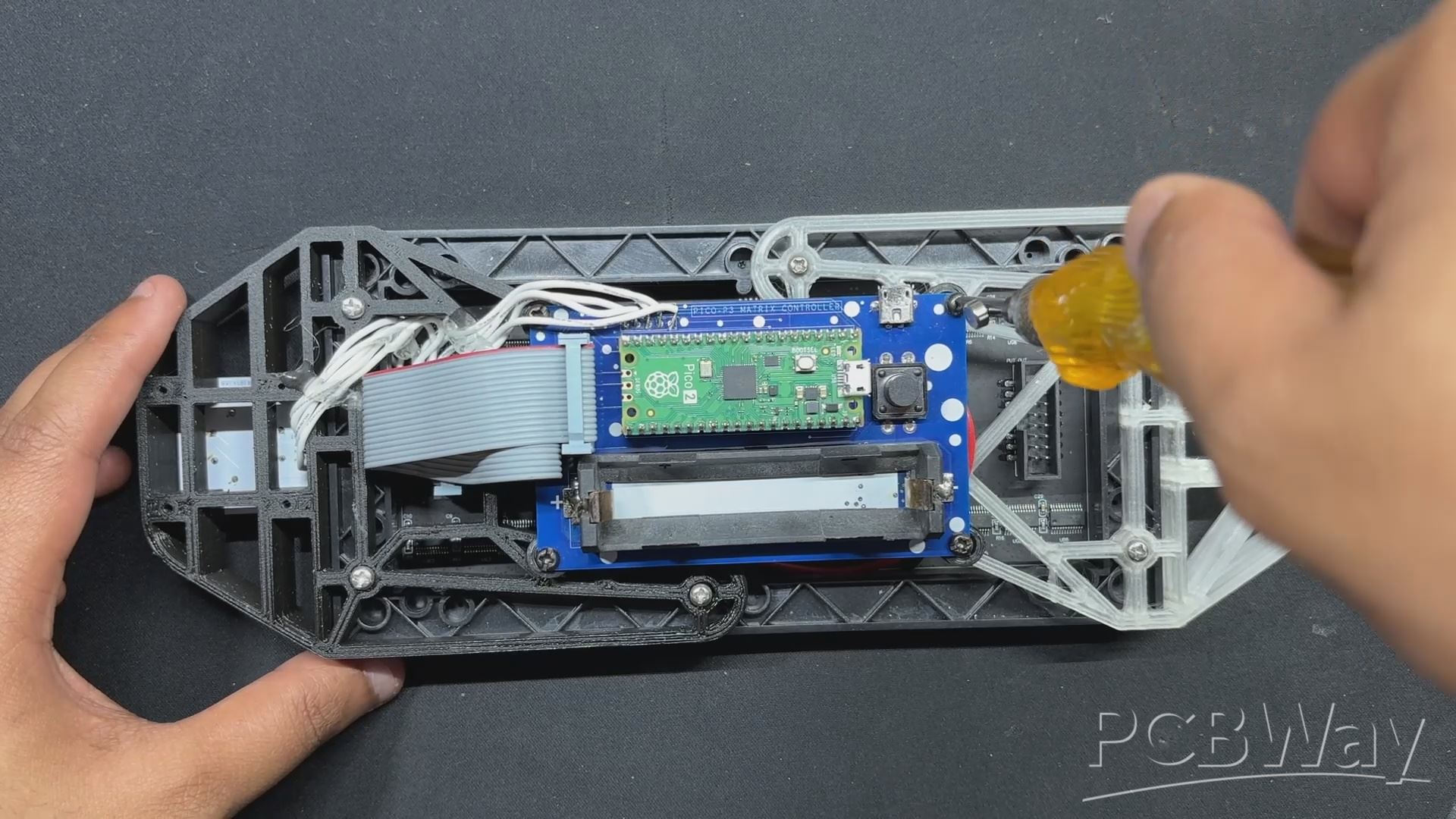 - By flipping the console over, we installed the button Board PCB with two M2 screws.