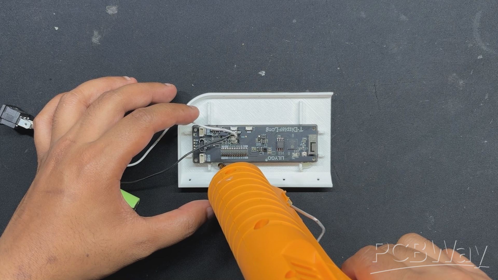 We apply hot glue to the entire board's perimeter to keep it in place. This will create a connection between the display and the screen holder.