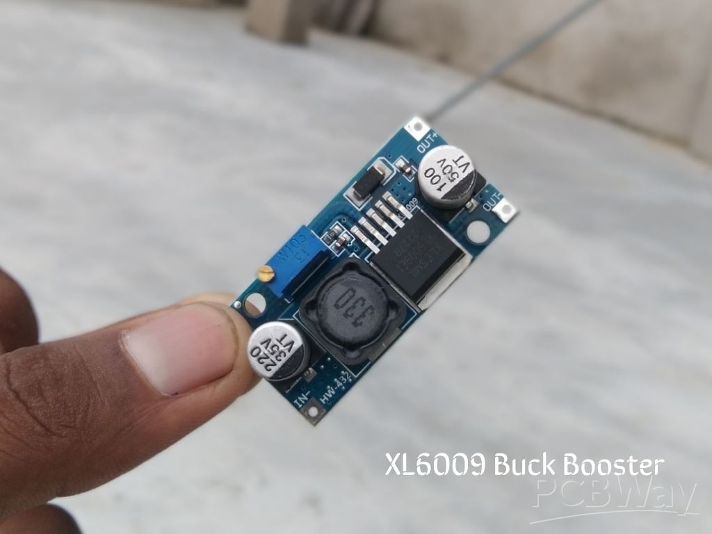 Now it’s time to wire everything together. The 18650 battery is first connected to the TP4056 charging module (stands for power bank module) —positive to B+ and negative to B-. From the TP4056, the battery also connects to the input of the XL6009 buck booster module, with the positive lead going to IN+ and the negative lead to IN-.
