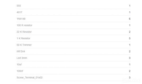 HEF 4017 entegre devre, NE555P zamanlayıcı entegresi, IRFZ44 MOSFET transistörleri ve 100 Watt'lık b...