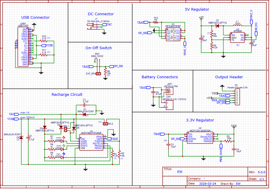 This circuit is a complete LiPo battery power management system that includes charging, voltage regulation, protection, and multiple output rails (3.3V and boosted 5V). It is divided into functional blocks: