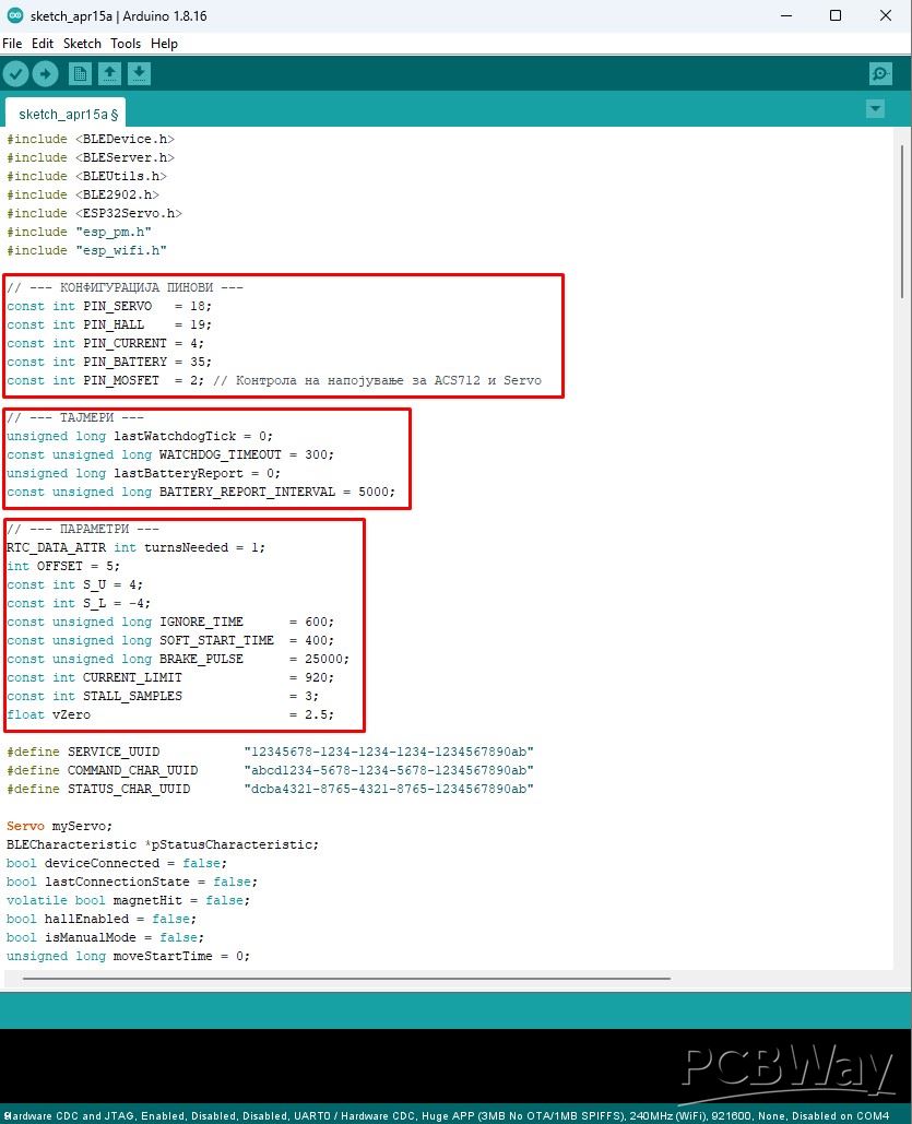 This is a crucial requirement in this type of development project, because very often when testing and changing components, quick changes need to be made to the code. I will describe all the variables that can be changed directly, as well as their functions in the circuit: