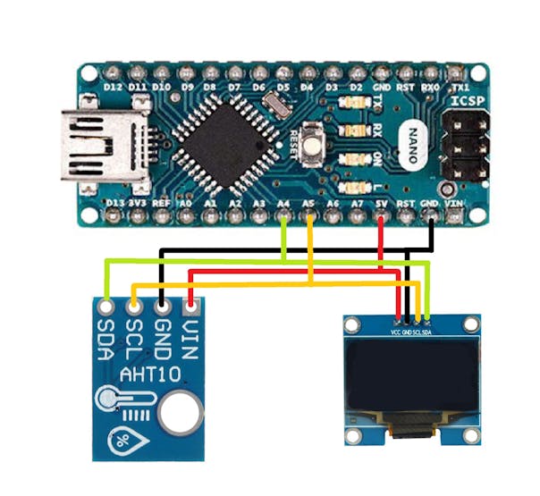 For the Temperature and Humidity Meter setup, we use an Arduino Nano as the main control unit, the AHT10 as the sensor, and an SSD1306 I2C OLED to display the temperature Readings we get from the AHT10 Sensor.