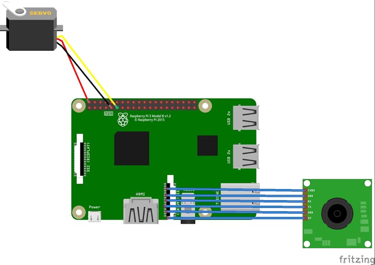 At last, add the servo motor to this project. Servo motor is GPIO pin 17 of the Raspberry Pi, which has the PWM function to control the angle of rotation.