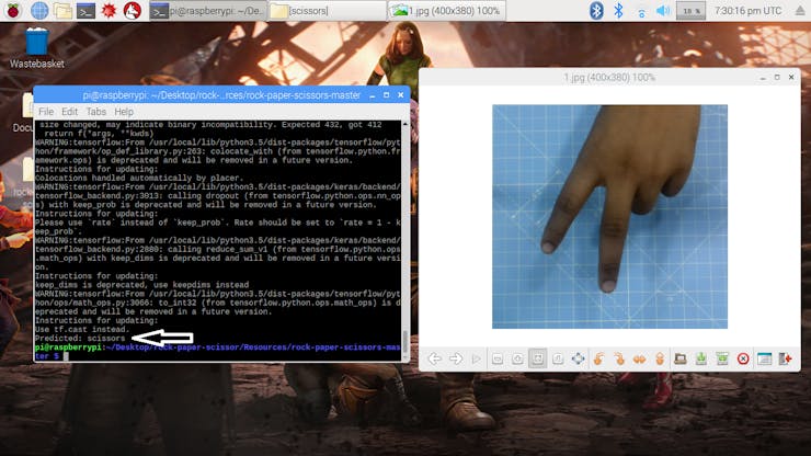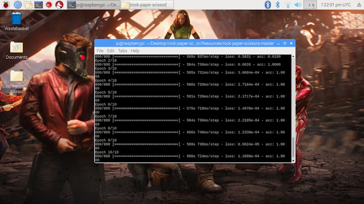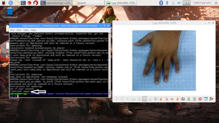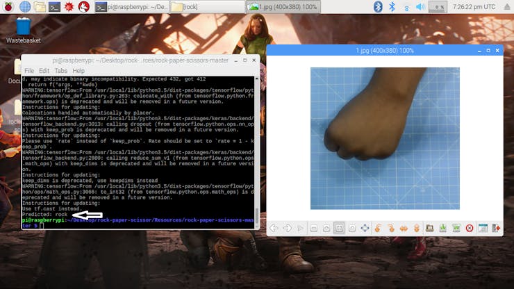 Once the model is loaded and the image is acquired by the camera, the model predicts the captured image using the SqueezeNet model loaded, and makes the prediction for the user's movements.