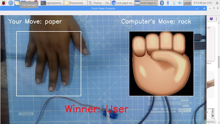 In this project, we will make an interactive game and play against the computer which is powered by AI to make decisions. AI uses the Camera connected to the Raspberry Pi to recognize what moves the user made with the hand, classify them into the best category(label) rock, paper, or scissors. Once the computer makes its move, the stepper motor connected to the Raspberry Pi points towards the