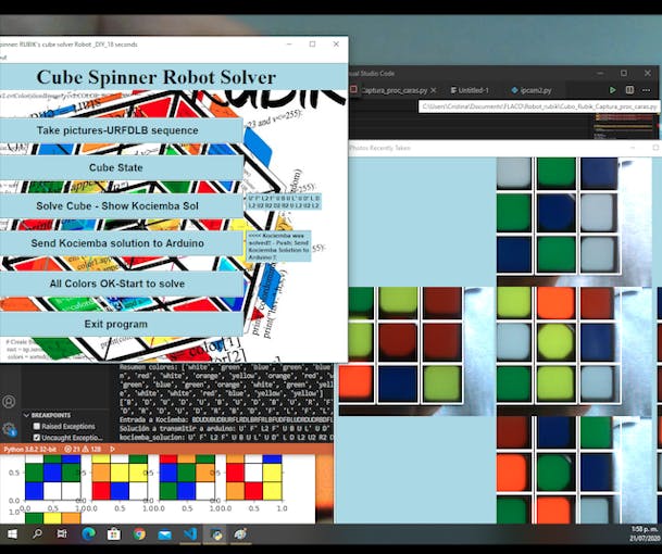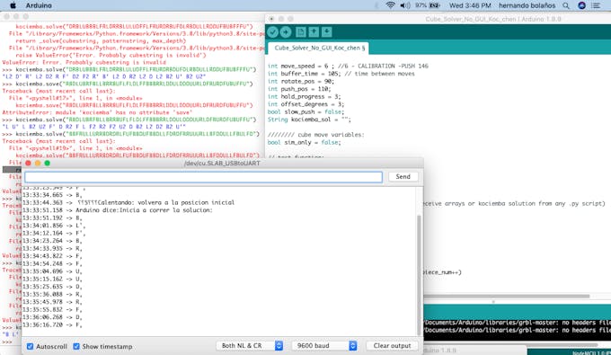 Upload the software and call the serial monitor to check movements report, one by one. Previously you need to call python IDE, call kociemba module enter the cube status and solve it, then paste the solution in the arduino program.