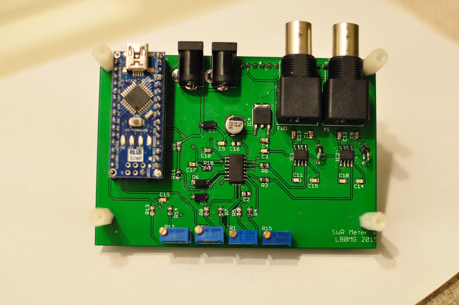 This was my first SMT design, and I am fairly happy with the result. The SWR and the power measurements seems accurate. I used the Arduino software from the book, and modified it to include a larger display and some other things. As you may notice, there are no buttons on the device. Originally I planned to use a rotary encoder and a bunch of menus, but as they say in the Soldersmoke podcast, menus are for restaurants. I totally agree. Besides, programming all kinds of features to the device is totally insane. This is a simple SWR meter and thats it.
