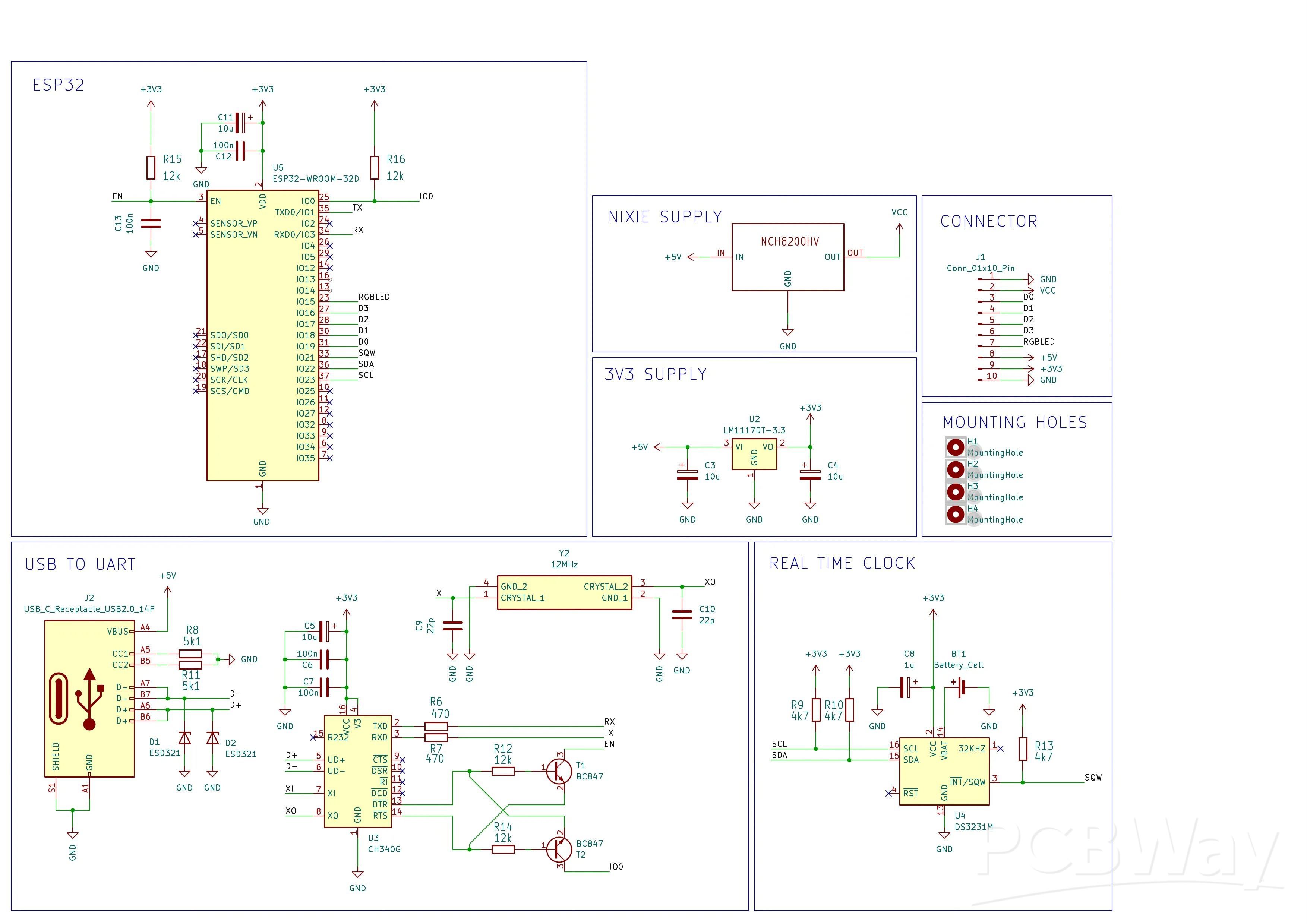 Control board is basically a re-packaged generic ESP32 board design connected with DS3231 real time clock and NCH8200HV high voltage boost module board.