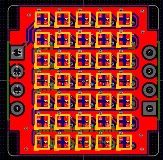 During the design process, it was found that the size of the WS2812 was too large to fit enough LEDs within the limited size, so I needed to continue to look for a smaller size. In the end, I found the right component, SK6805-EC15 from OPSCO, and successfully implemented a 5X7 LED matrix.