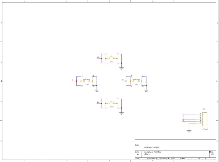 Next, we get the Schematic for Button Board prepared. It has four push buttons, with the 4 and 3 pins of each button connected to GND. Additionally, there is a CON5 connector that is attached to each connector's 1 and 2 for GPIO and 3 and 4 for GND.