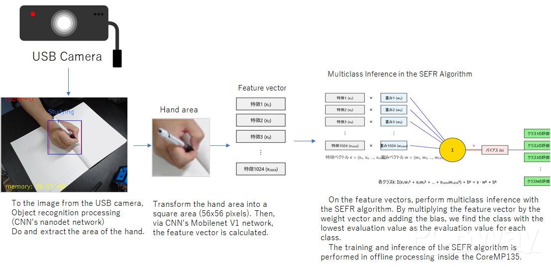 Class classification inference is performed from an image of a hand region. MobileNetV1, a CNN, is used to find the feature vectors in the class classification. The SEFR algorithm is a classifier algorithm that can be used even when device resources are limited.
