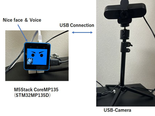 The LCD screen of the CoreMP135 device displays an expressive face. The right cheek of the face is also equipped with a function to display a USB camera that monitors the state of your hand.