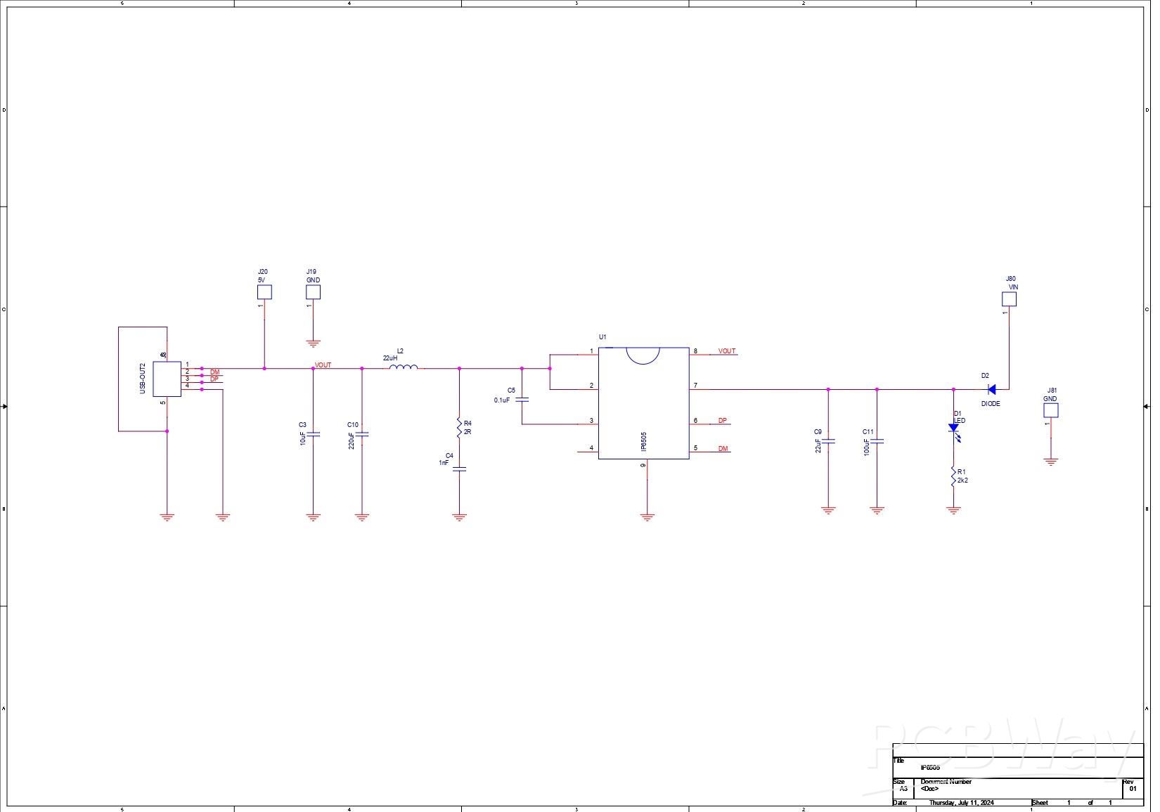 We created an initial layout using the IP6505 datasheet as a guide. It included a few resistors and capacitors linked to the IP6505 in the suggested setup.