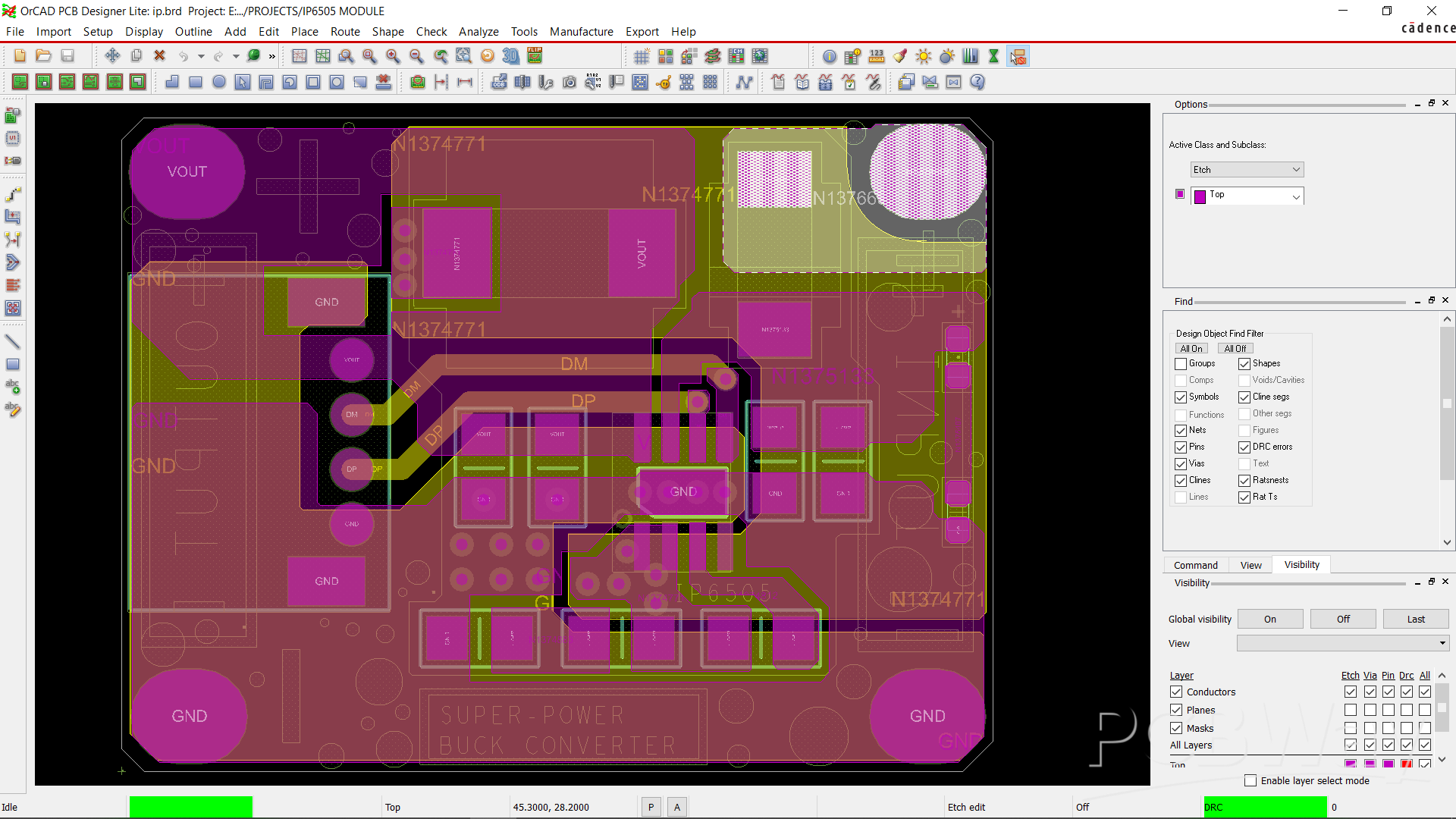 Following the creation of the board schematic, we moved on to the PCB design. This included creating a 40 mm by 30 mm board with input terminals on one side and USB on the other. According to the specification, the IP6505 is positioned in the center, and the input and output capacitors are positioned as close to the IP6505 as possible.