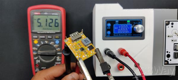 We gave the power module 13V by connecting the bench power supply's alligator clips to the module's input terminals. We connected our multimeter to the output side, and the result showed 5.1V, indicating that the setup was successful. When several PD-using devices are connected, the output voltage will vary.