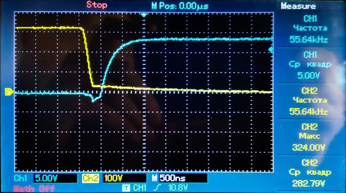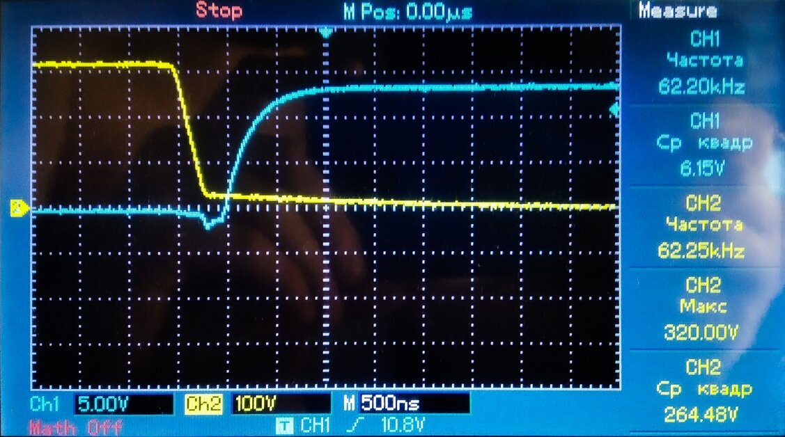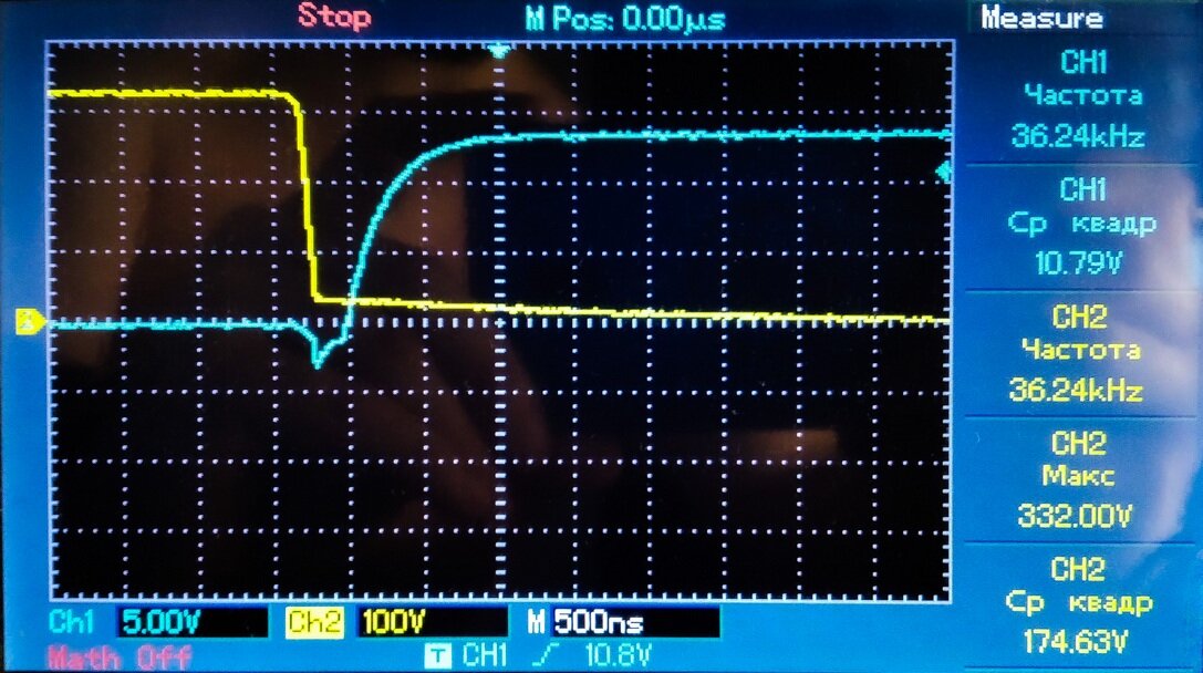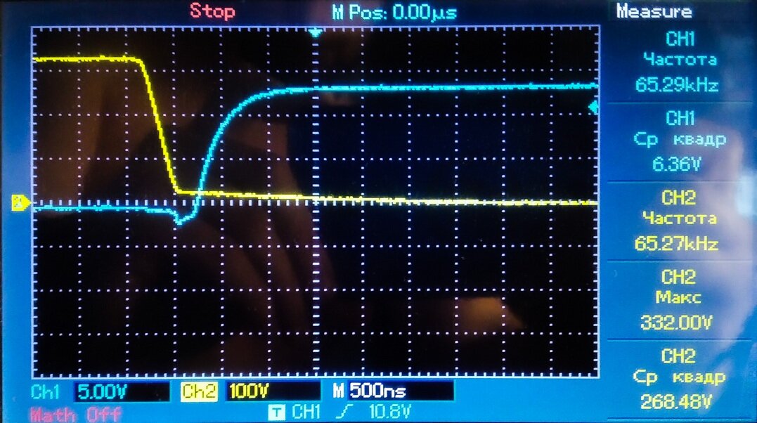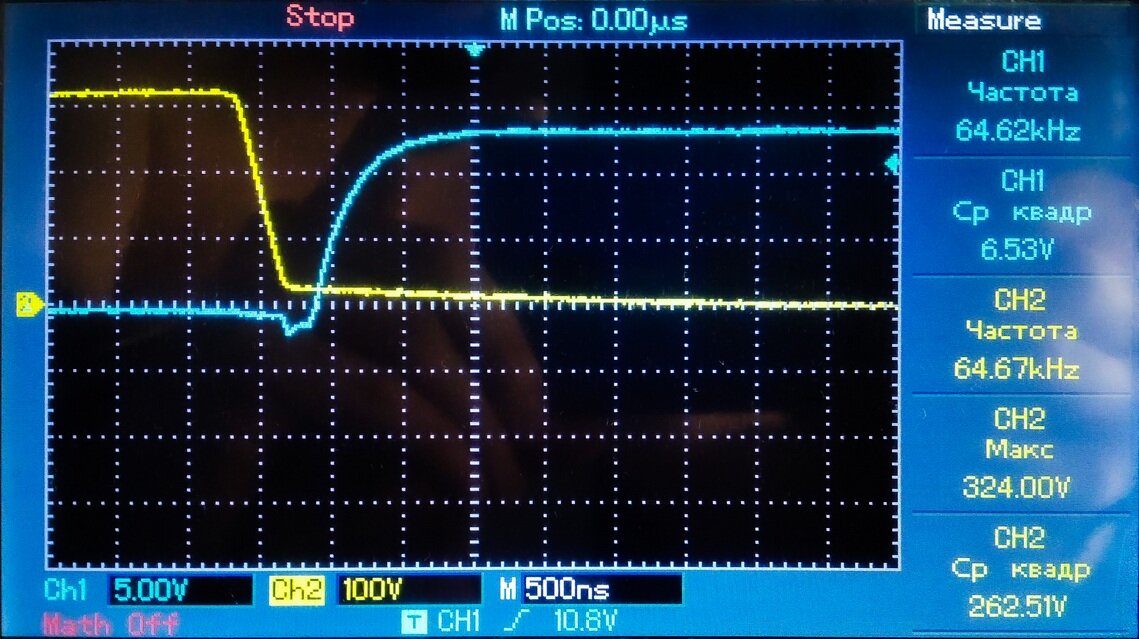 Здесь и далее: желтый луч - напряжение на стоке нижнего по схеме транзистора, синий луч - напряжение на затворе этого же транзистора.