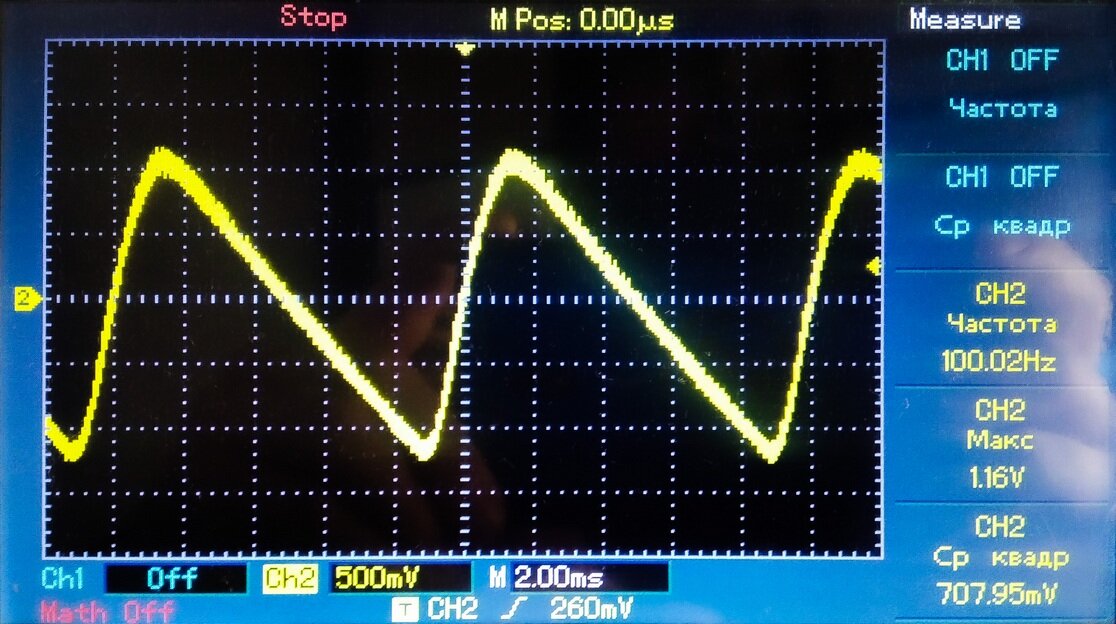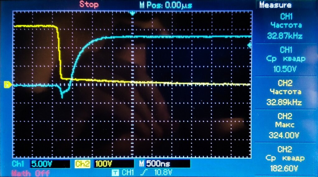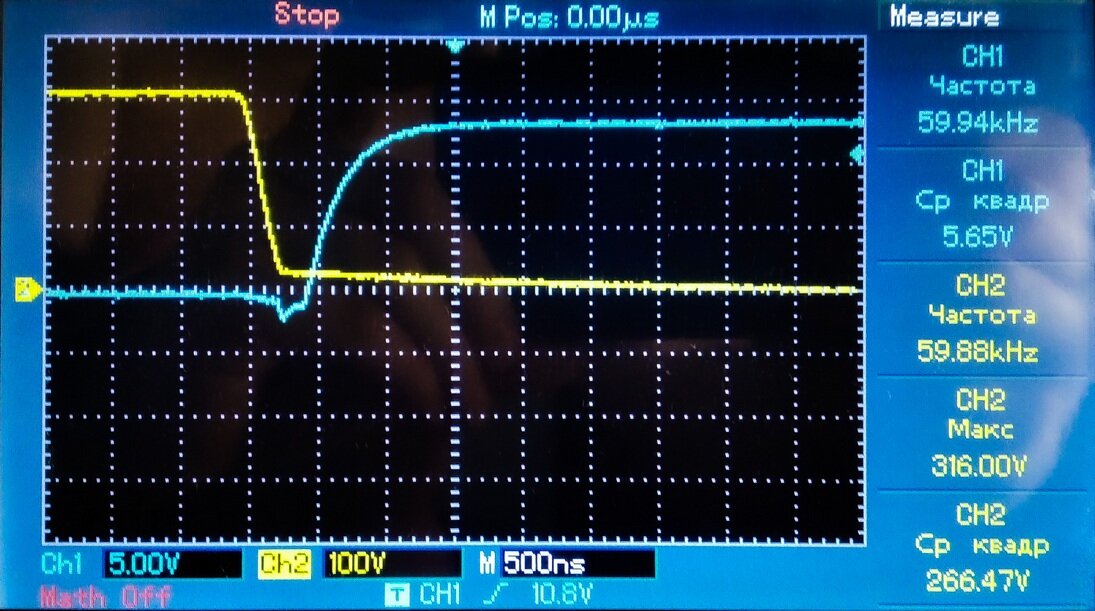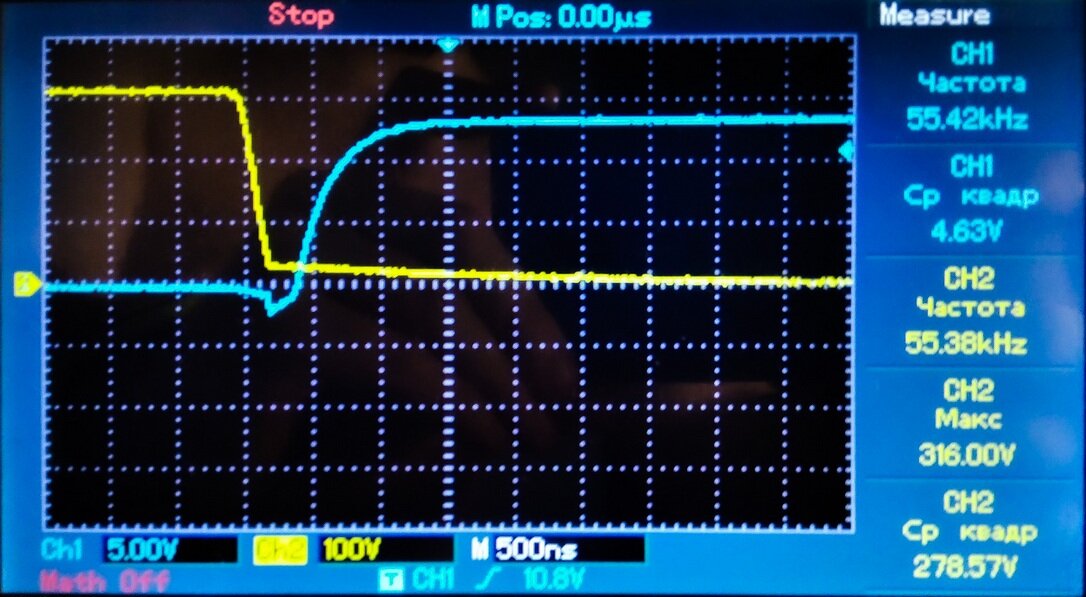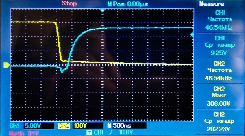 Здесь и далее: желтый луч - напряжение на стоке нижнего по схеме транзистора, синий луч - напряжение на затворе этого же транзистора.